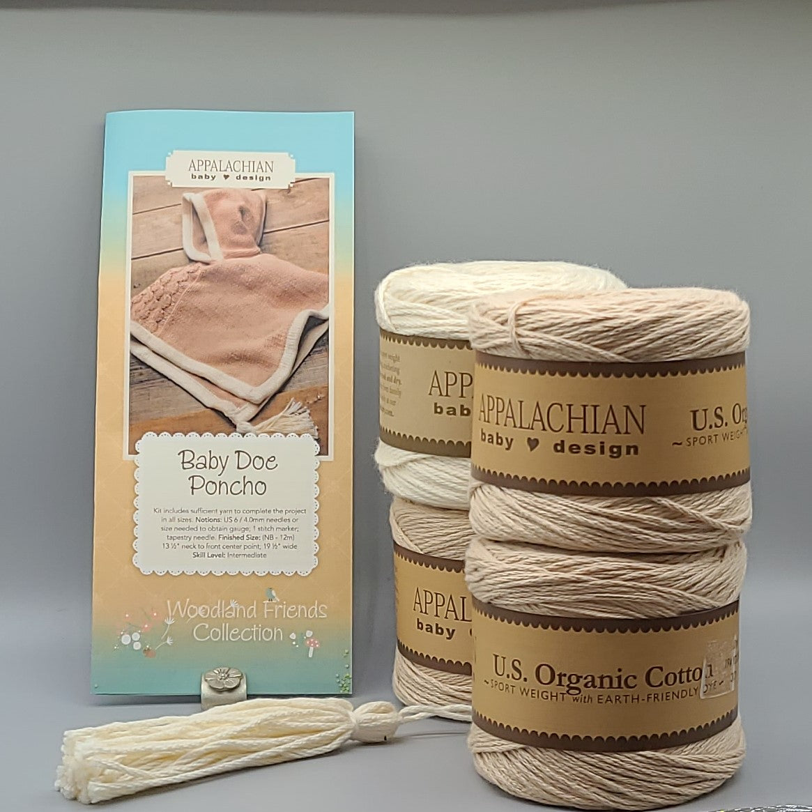 The Baby Doe Poncho is a cute and cozy hooded baby wrap. The adorable white tassel on the hood adds a charming touch (and it comes included with the kit!). Its loose design allows for a comfortable fit for newborns up to 12 months.